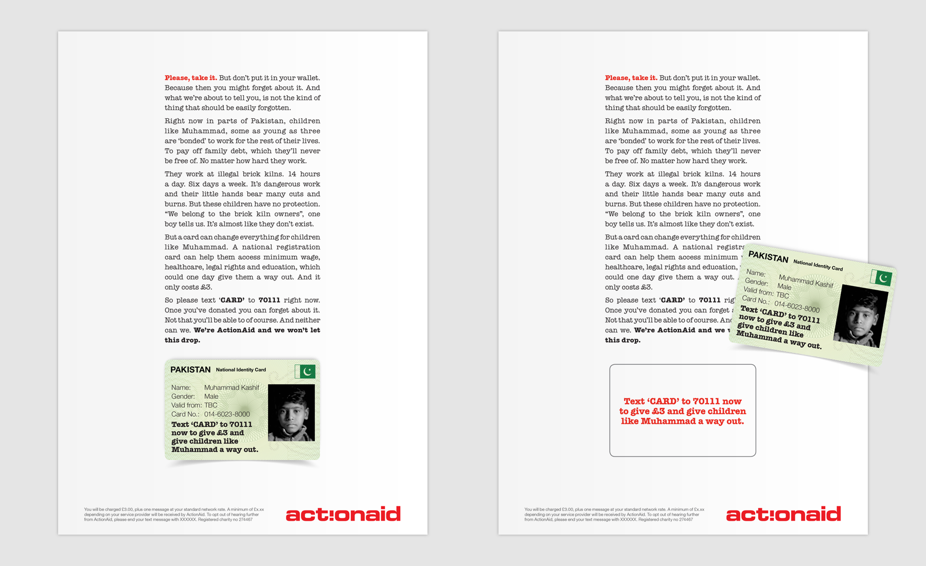 To work along with a direct mail campaign about bonded labour in Pakistan an advert was produced to appear in Wired Magazine. An ID card similar to those used in Pakistan was tipped-on to the advert.