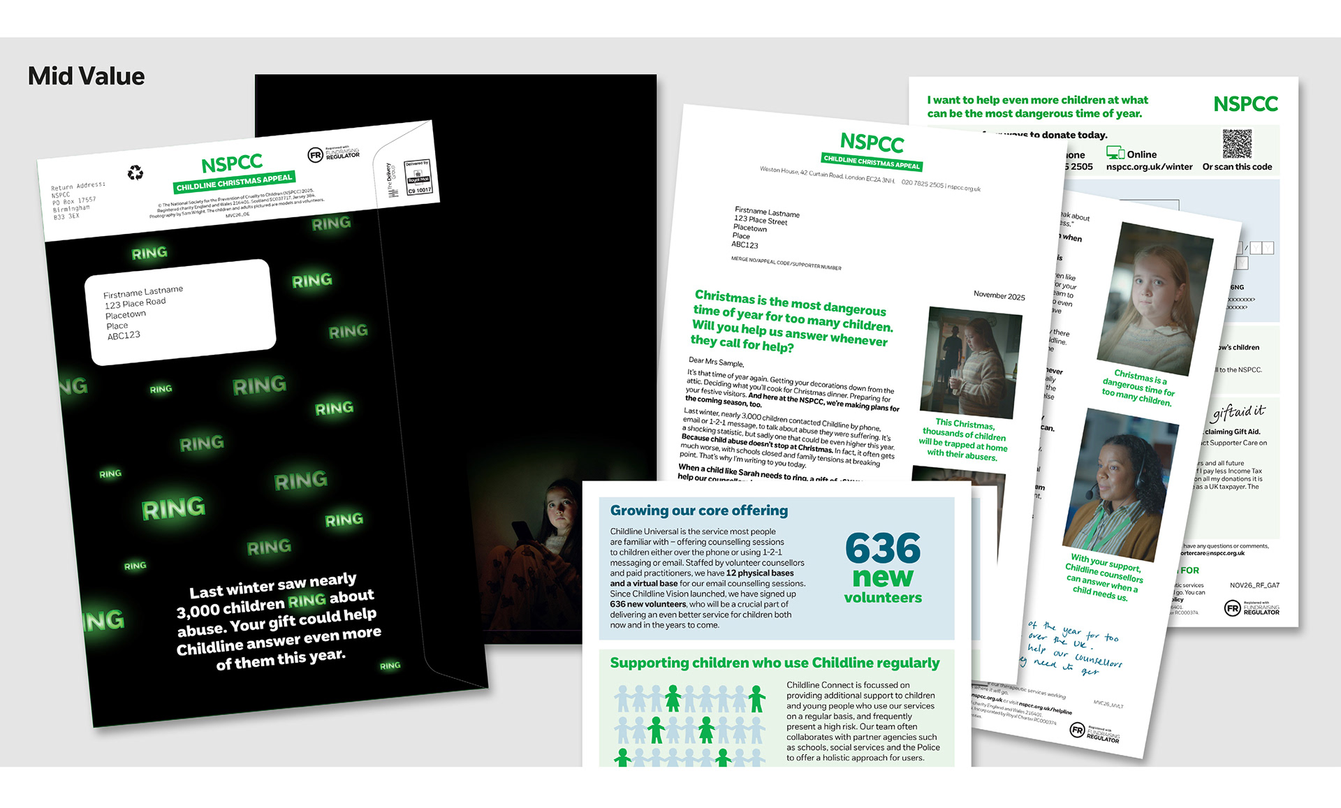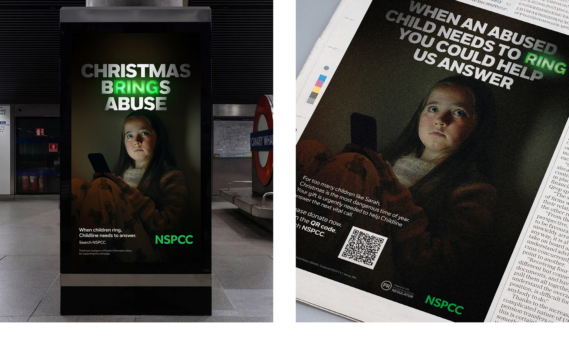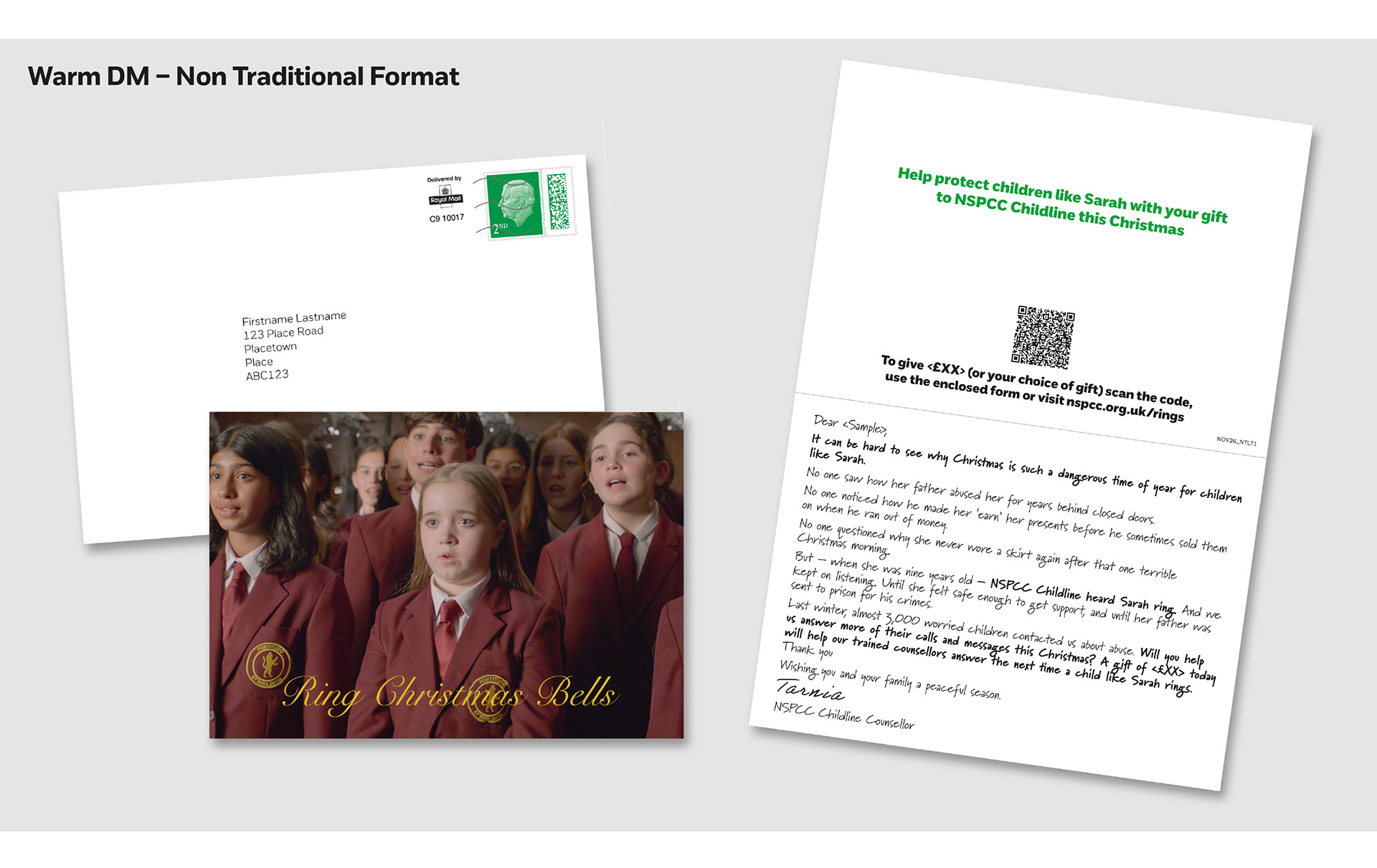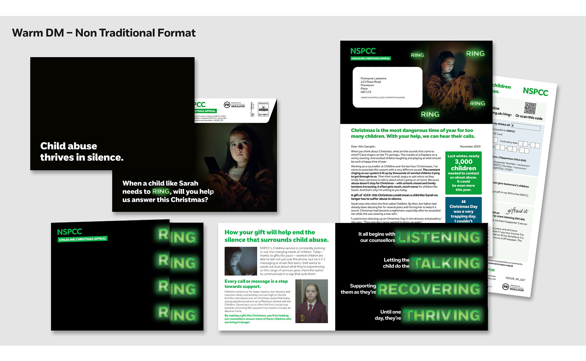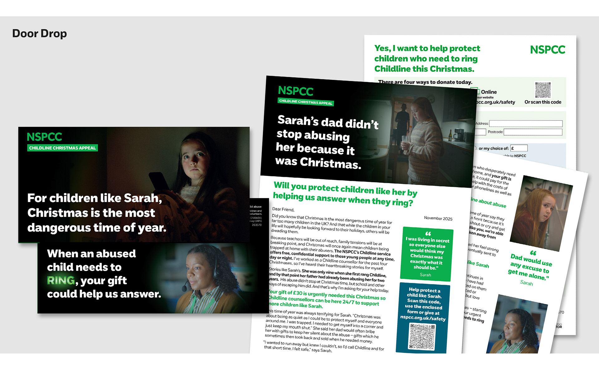 With schools closed and safeguarding protections reduced, Christmas is the most dangerous time of year for too many children. As part of the ‘RING’ multi-channel integrated campaign for NSPCC Childline I was responsible for the Direct Mail design (for the Good Agency), working across Standard, Non Standard, Door Drop and Mid Value Packs, uniting brand and fundraising in a powerful, emotional story that brought home the reality of Christmas for thousands of children.
